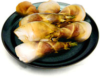 ササ属。大名竹(大明竹)とも呼ばれます。西南日本に広く分布していますが、 特に九州南部でよく食べられています。孟宗竹よりもおいしいそうです。(私はまだ食べた事がありません。) 7月~8月に出回ります。 | |